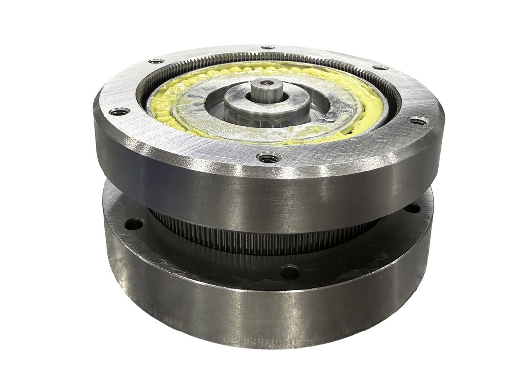 Der kombinierte Typ der FDS-Serie verfügt über die gleichen vier Kernkomponenten wie der Pfannkuchenkomponent.mit der Ausnahme, dass der kombinierte Typ zusätzliche Vorder- und Hinterdichtungsflansche und Stützlager umfasst. Die FDS-Serie arbeitet nach demselben Arbeitsprinzip wie die FSG-Serie mit Becher.und die Wellengeneratorlager sind in zwei Reihen angeordnet, wobei die Zahnbreite der kreisförmigen Spline und der Flexspline erhöht wird, um eine höhere Drehmomentkapazität zu bewältigen.der Pancake-Typ enthält eine zusätzliche kreisförmige Spline mit der gleichen Zahnzahl wie die Flexspline für die Anbindung an die Ausgangswelle.